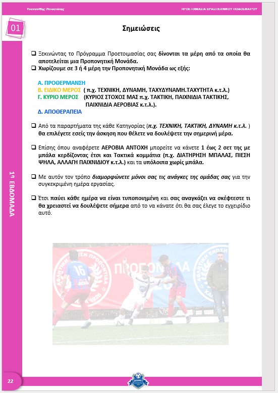 Το εγχειρίδιο " ΠΡΟΕΤΟΙΜΑΣΙΑ ΕΡΑΣΙΤΕΧΝΙΚΟΥ ΠΟΔΟΣΦΑΙΡΟΥ- Αναλυτικό Πρόγραμμα 8 Εβδομάδων " απευθύνεται κυρίως σε προπονητές ποδοσφαίρου όλων των ερασιτεχνικών κατηγοριών και περιλαμβάνει περίπου 250 σελίδες γεμάτες με μοντέρνες ποδοσφαιρικές ασκήσεις και παιχνίδια φυσικής κατάστασης με μπάλα και χωρίς μπάλα, τεχνικής, τακτικής, δύναμης, συντονισμού και ευλυγισίας. Στις σελίδες του θα βρείτε οδηγίες οργάνωσης της προπόνησης, λεπτομερή περιγραφή και αναλυτικότατα και εντυπωσιακά σκίτσα με την βοήθεια του ειδικού σχεδιαστικού προγράμματος Tactics Manager της Soccer Tutor που έχουν σαν στόχο να προσφέρουν στους προπονητές ένα ολοκληρωμένο πρόγραμμα προετοιμασίας για ερασιτέχνες ποδοσφαιριστές.